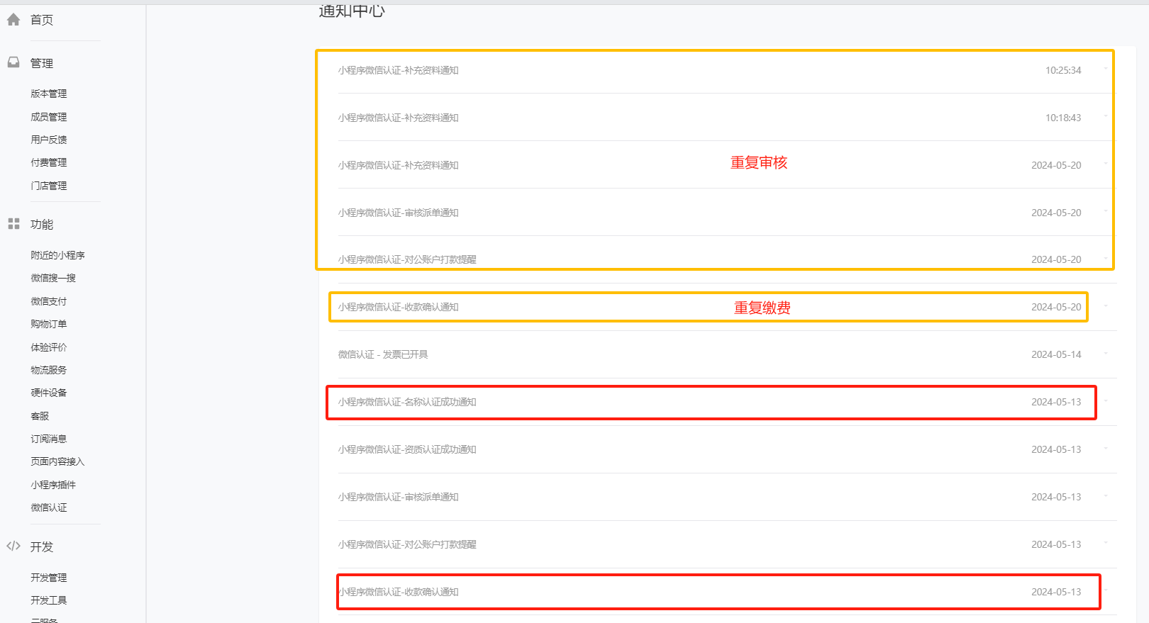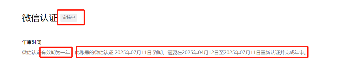 问题描述:2024年5月13日已办理微信认证,审核通过,2024年5月20日还提示需要前往年审,导致重复缴费300元