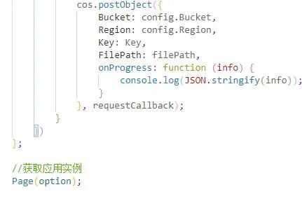 Page({ //上传按钮事件处理函数 uploadToCos: function() { // 选择上传的图片 wx.chooseImage({ success: function(res) { // 获取文件路径 var filePath = res.tempFilePaths[0] // 获取文件名 var fileName = filePath.match(/(wxfile:\/\/)(.+)/) fileName = fileName[2] // 文件上传cos cos.postObject({ Bucket: config.Bucket, Region: config.Region, Key: fileName, FilePath: filePath, }, requestCallback) } }) } })