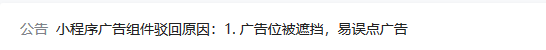 广告应用规范请详细了解下:https://wximg.qq.com/wxp/pdftool/get.html?id=rynYA8o3f&pa=10&name=miniprogramAds_supplier_guidance