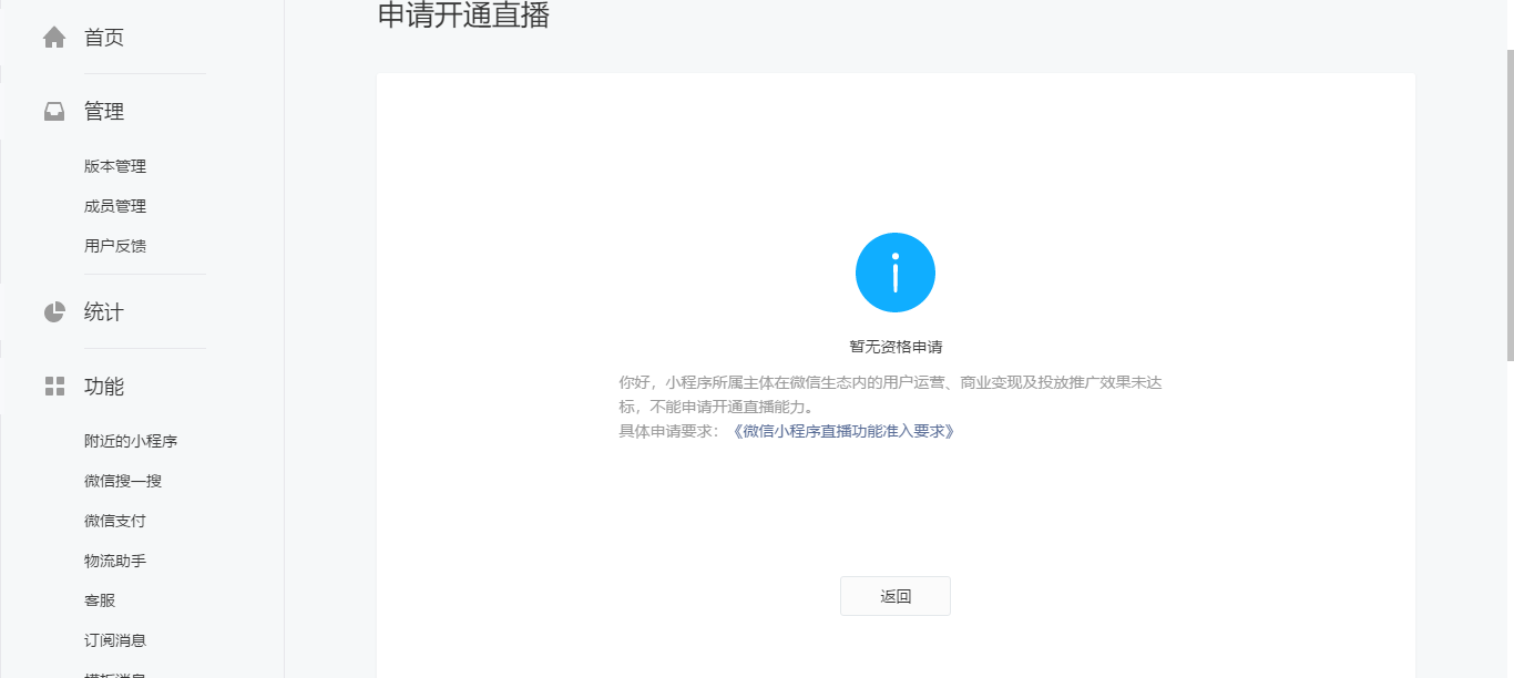我想要开通小程序直播功能,对照了一下我的小程序运营要求符合《微信小程序直播功能准入要求》的1、2、3的条件,但是还是一直出现:“程序所属主体在微信生态内的用户运营、商业变现及投放推广效果未达标,不能申请开通直播能力。”的反馈提示,这个是什么原因,请问有相关管理团队能帮忙看下吗?