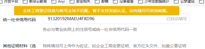 小程序认证填写资料后,一直报错:主体工商登记信息与账号主体不匹配,暂不支持发起认证。如有疑问可咨询客服。