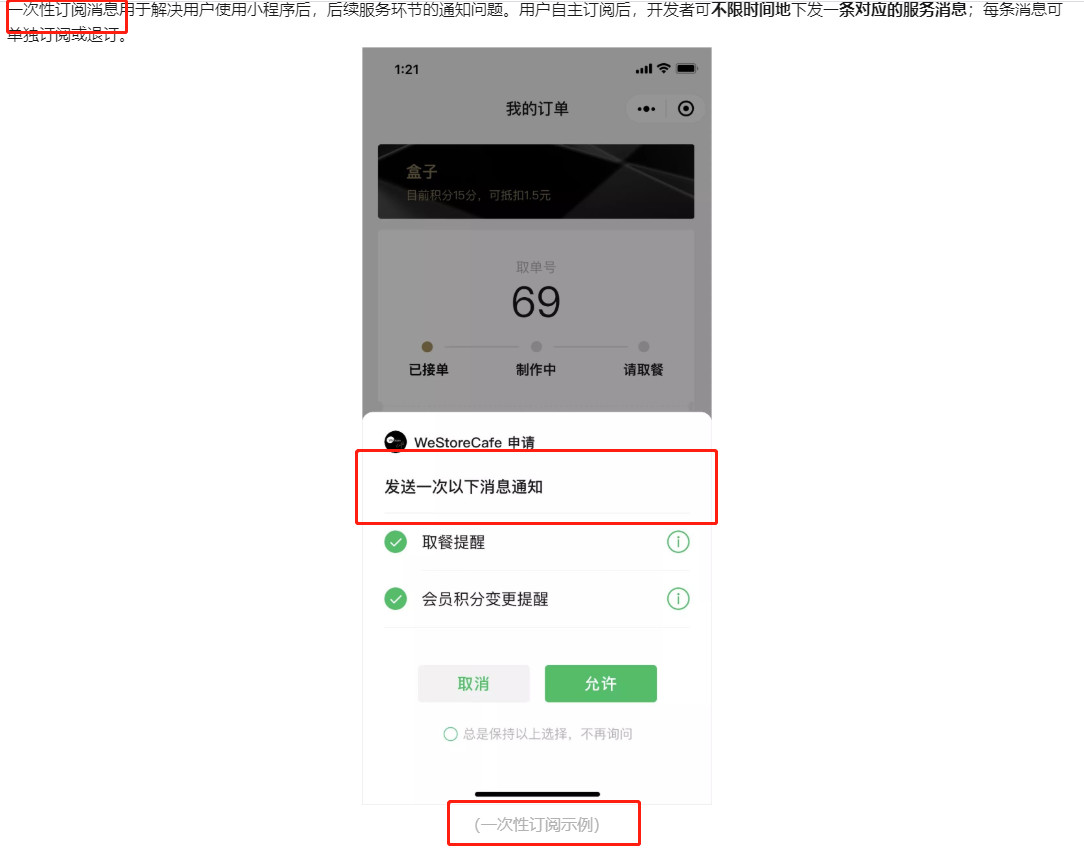 我刷社区好多次,都对长期订阅没有落地的概念,就是我不知道他是什么样子。看见了微信给出的一次性订阅是这样的