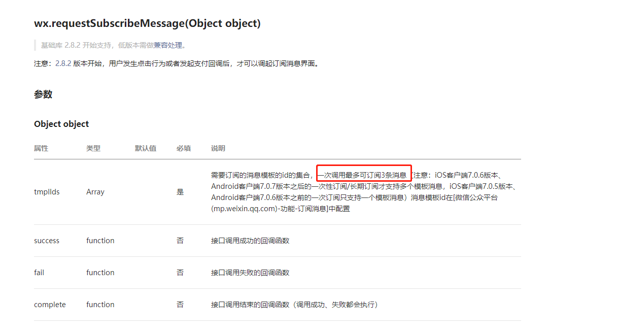 第一个红框的文字改成:一次调用最多可订阅3种消息各一条共3条消息,你就不会误解了。