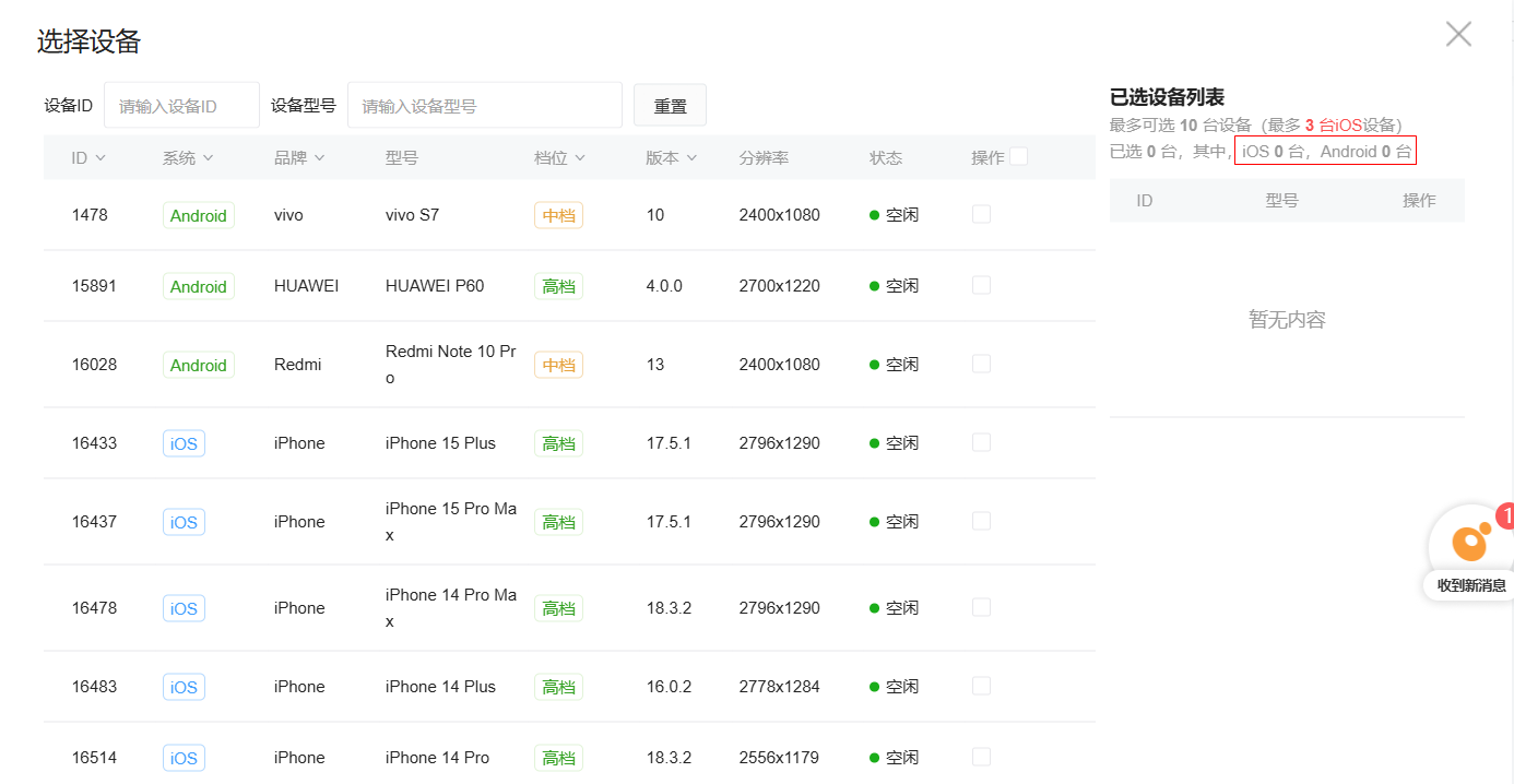 2、如果“云测试服务”已经提供了平板电脑,请看下图,已经选择的测试设备种类和数量需要更详细一些:iOS 手机几台,iPad 几台( iOS 平板几台 ),Android 手机几台,Android Pad 几台( Android 平板几台 )。