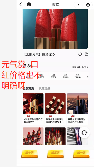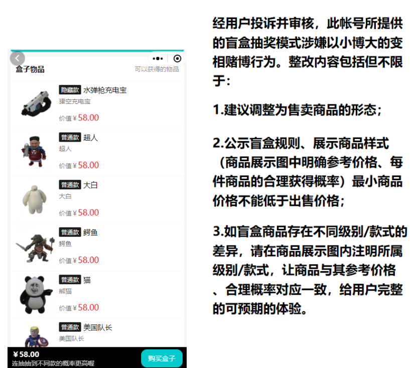 这三个盲盒 他们也存在商品价格不明确 已大博小,为什么他们没有事情啊?我们客户的程序到底哪里有问题,还请ye明说