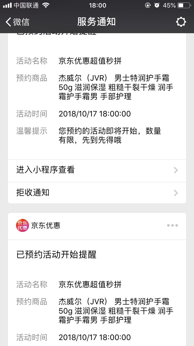 请问: 如图【京东优惠】活动订阅提醒, 【已预约活动开始提醒】模板连续推送两条一模一样的提醒内容,