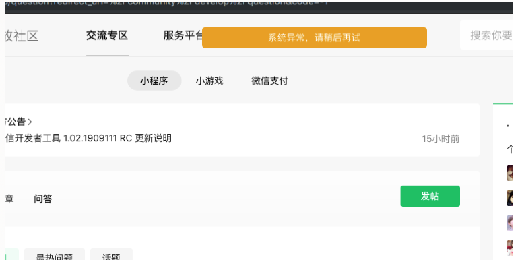2、开发者社区,chrome浏览器扫码登录后,再次刷新,页面头部显示“系统异常,请稍后再试“