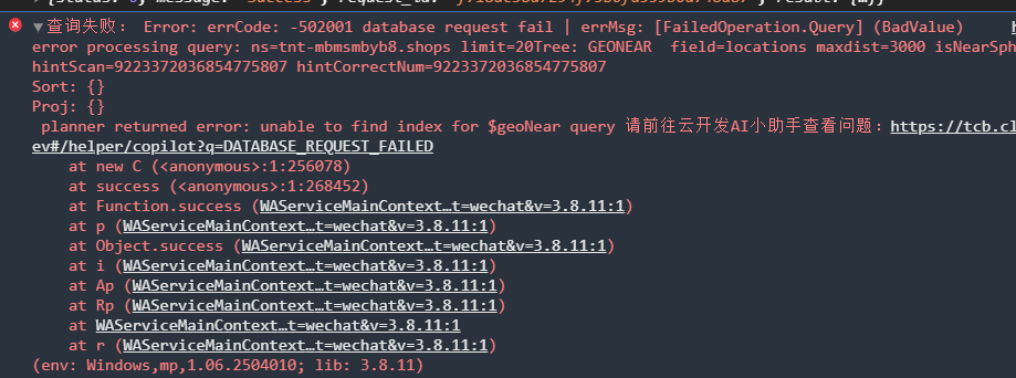 查询失败: Error: errCode: -502001 database request fail | errMsg: [FailedOperation.Query] (BadValue) error processing query: ns=tnt-mbmsmbyb8.shops limit=20Tree: GEONEAR field=locations maxdist=3000 isNearSphere=0 hintScan=9223372036854775807 hintCorrectNum=9223372036854775807