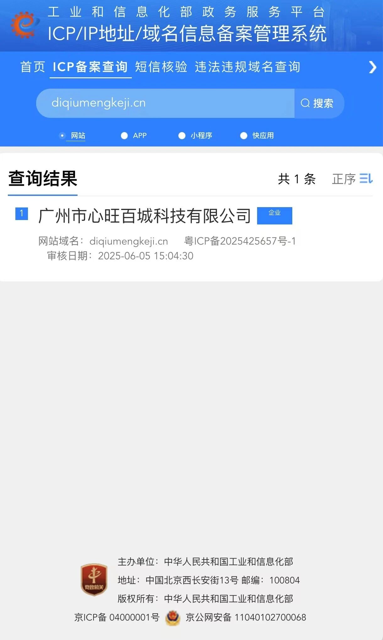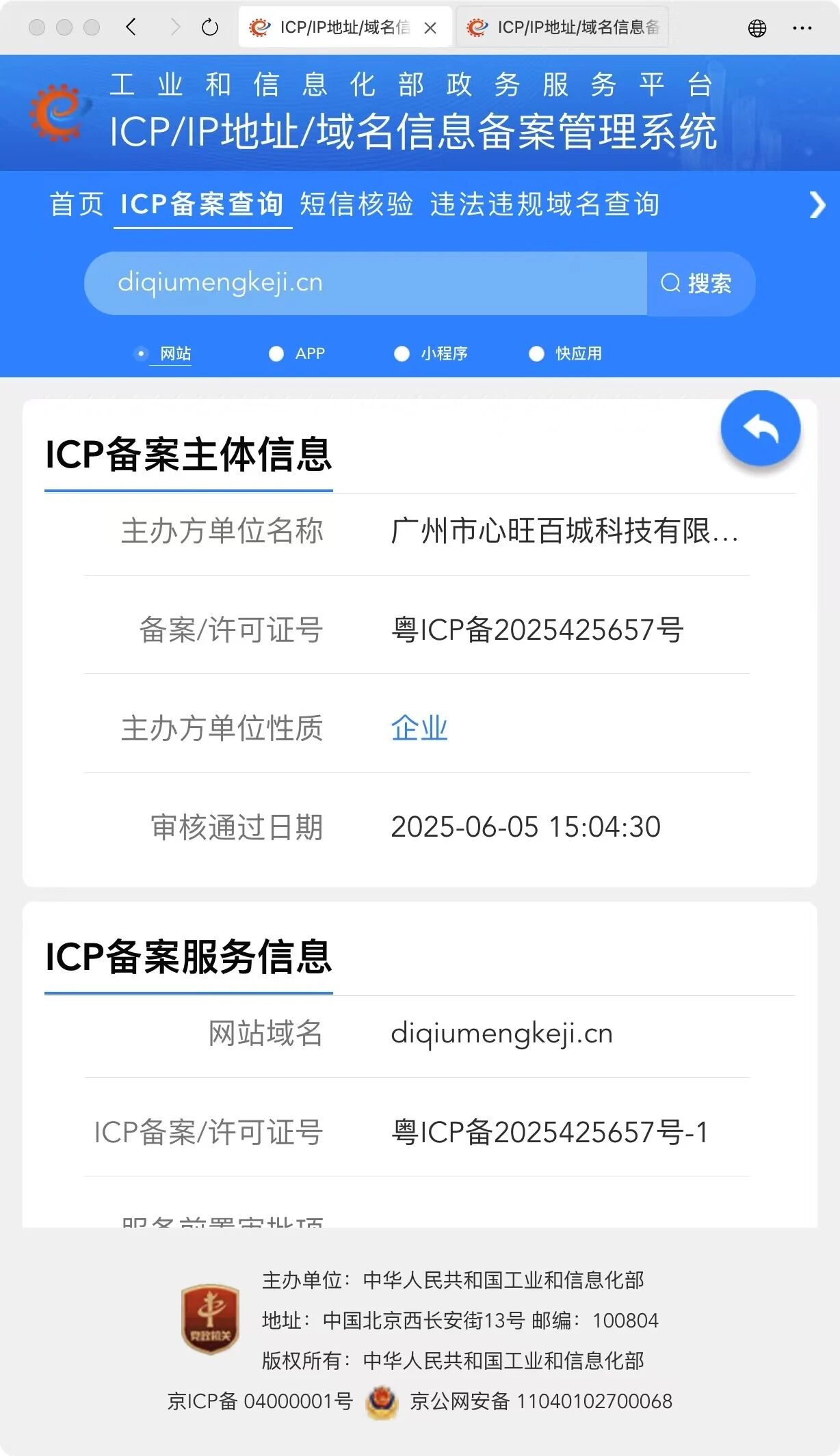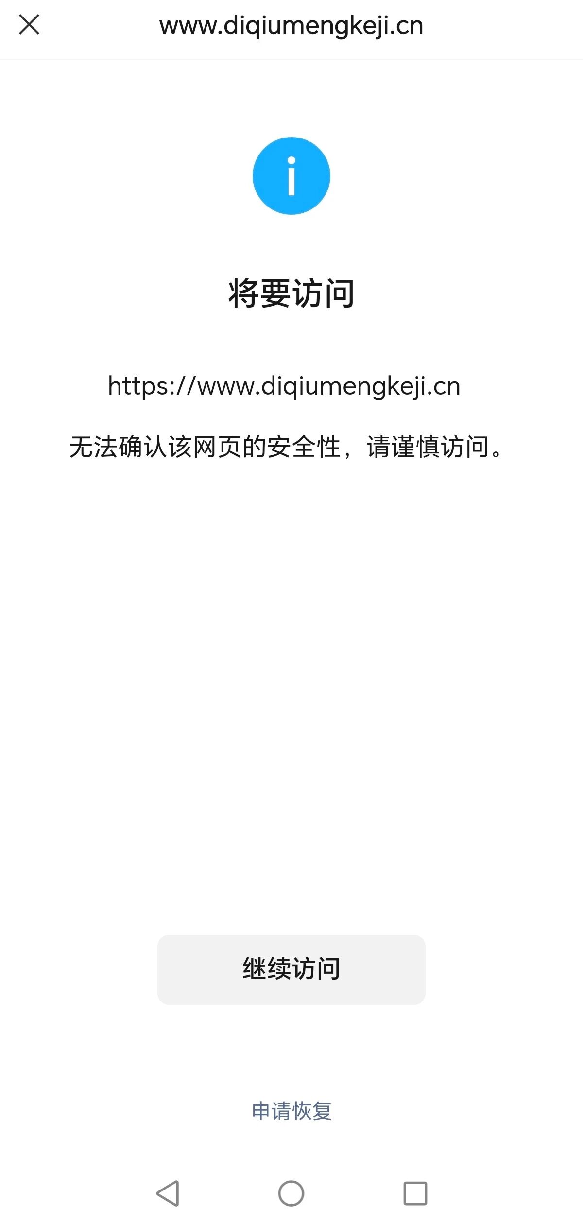 域名diqiumengkeji.cn于2025年05月26日注册,于2025年06月05日备案通过,工信部ICP备案号:粤ICP备2025425657号-1,用于建立广州市心旺百城科技有限公司有限公司官网展示,经建站技术人员排查,不存在安全问题。但是在微信里打开网站链接,却提示“无法确认该网页的安全性,请谨慎访问”,现申请解除封禁。