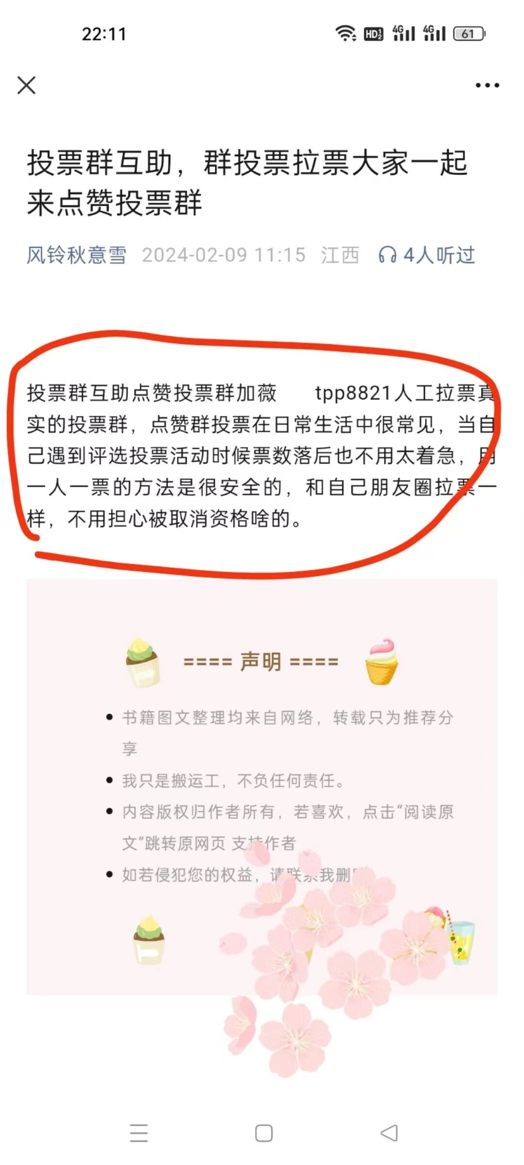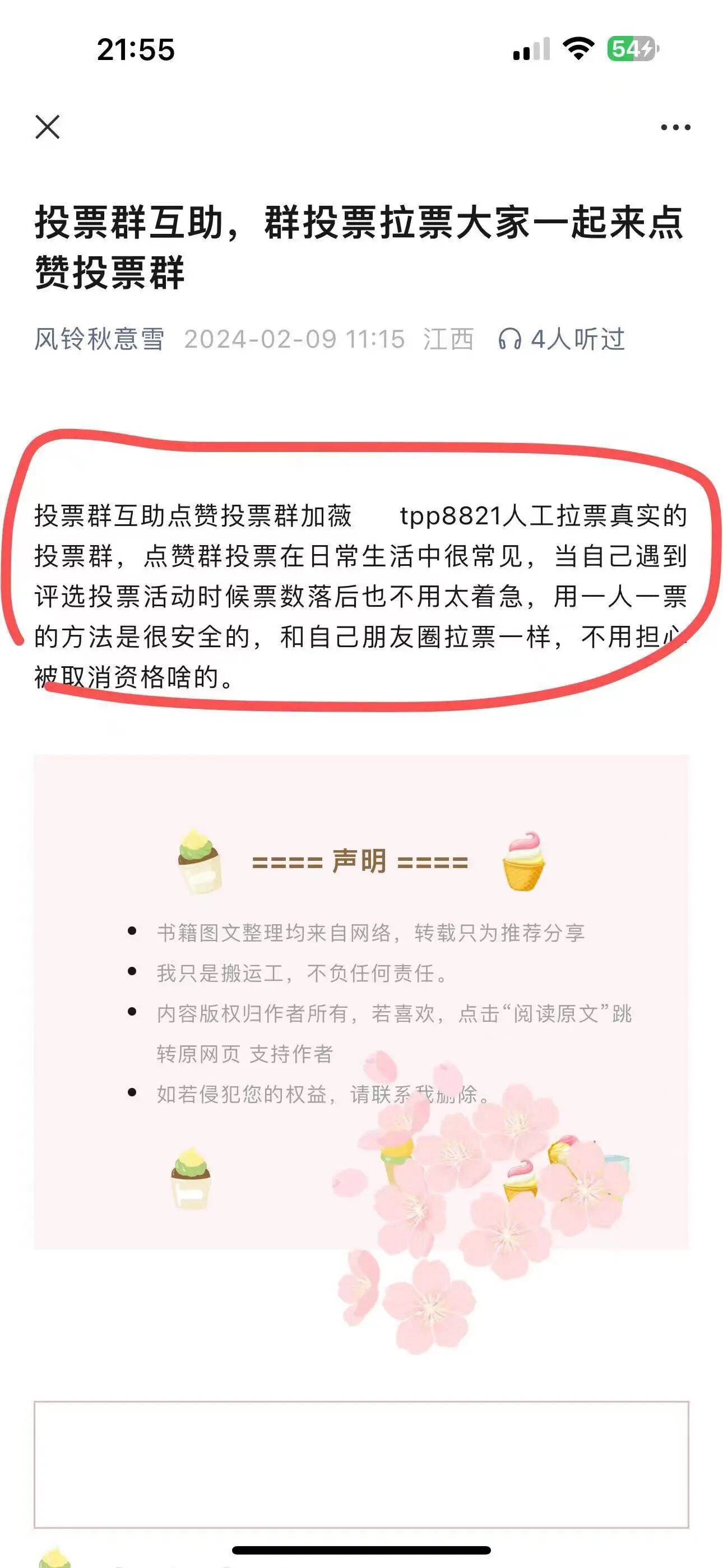 以关键词【投票群】利用微信公众号发布文章留微信号恶意引流刷票,多次发布微信投票刷票刷单诈骗垃圾广告,