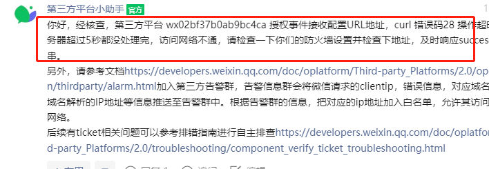你好,经核查,第三方平台 wx02bf37b0ab9bc4ca 授权事件接收配置URL地址,curl 错误码28 操作超时。服务器超过5秒都没处理完,访问网络不通,请检查一下你们的防火墙设置并检查下地址,及时响应success字符串。