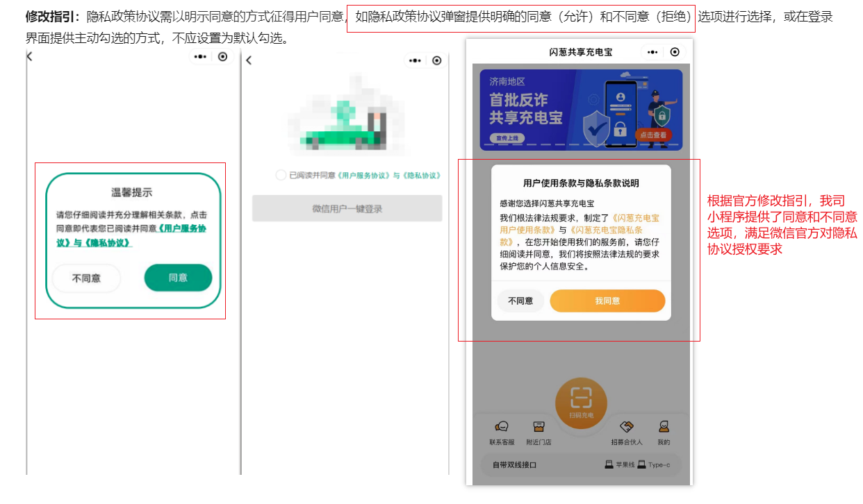 说是违反了微信隐私授权规范,被禁了搜索,但交互设计规范与微信官方修改建议是一致的,以前申诉过一次成功了,这次两次申诉都不成功。无奈只能改了交互:点【不同意】直接退出小程序。(以前点不同意弹出toast提示,见下图a)