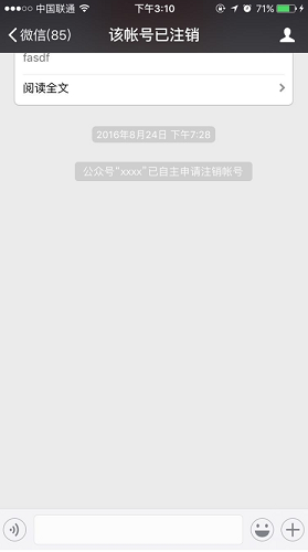 用户端会收到提示:公众号“XXX”已自主申请注销帐号