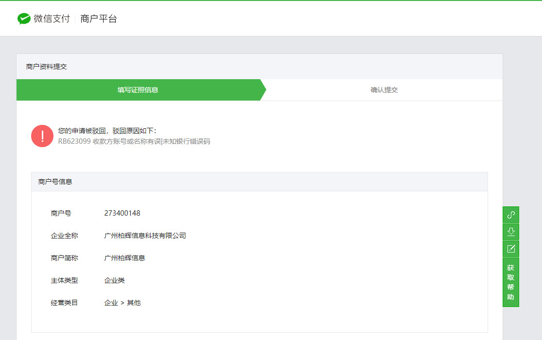 官方同学您好,我司在微信特约商户平台帮一个商家录入资料以后,确认无误以后提交。但是两次认证失败均是以“RB623099 收款方账号或名称有误|未知银行错误码”为由驳回。