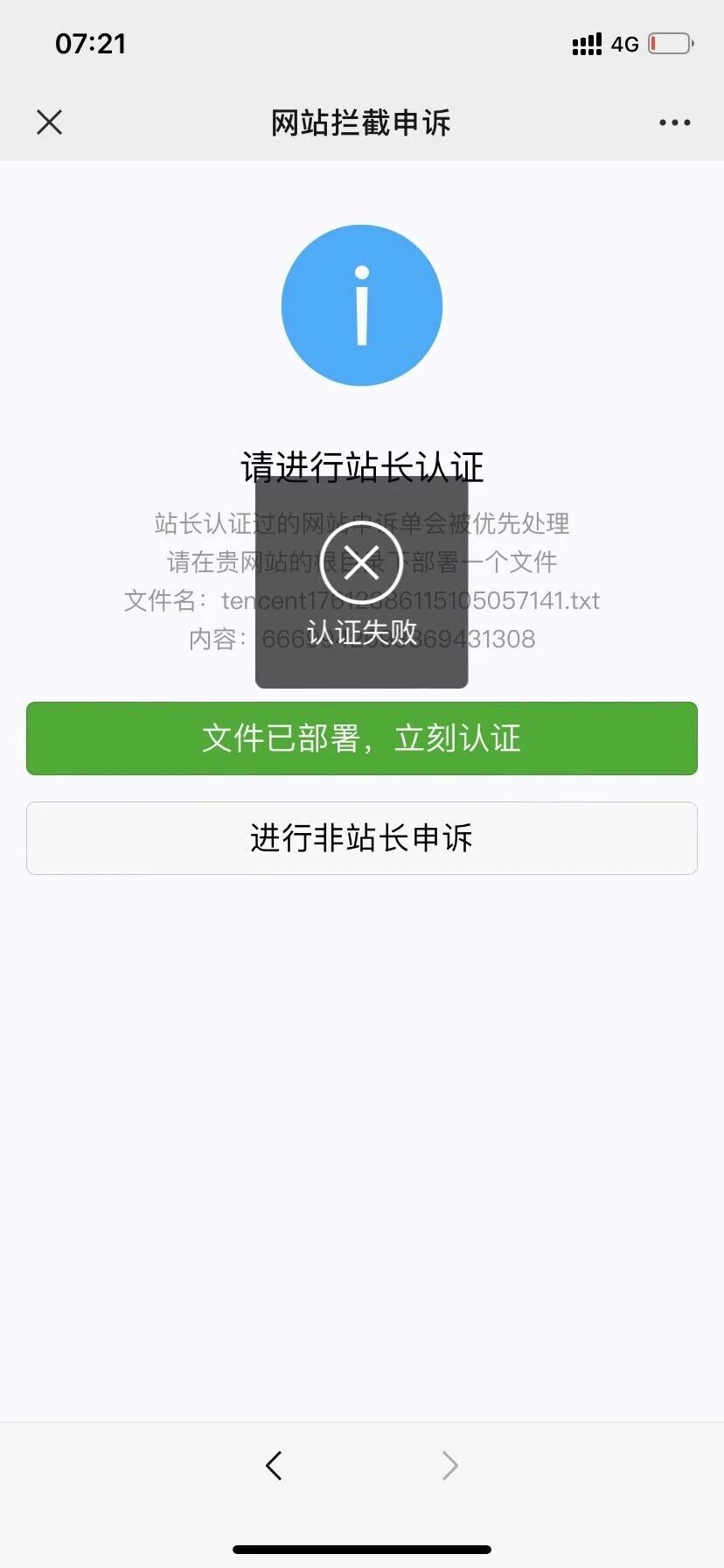4月7日新下来的备案域名,准备用作小程序上线使用,可是微信内部提示涉及色情内容,禁止访问。经自身仔细排查小程序后,未发现有所说色情实质内容,后进行站长认证申诉,文件部署后一直显示认证失败。https://cps.yoyobaohe.com/tencent17612386115105057141.txt 浏览器可以正常打开,但是不知道什么原因一直认证失败,希望各位领导看到时能够百忙之中抽出时间审核查看帮忙解决一下,万分感谢!