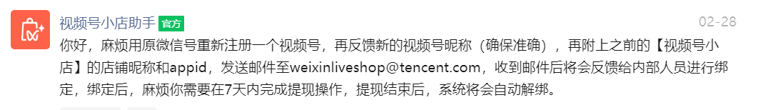 视频号不小心注销了,目前无法登录视频号小店,发了邮件到weixinliveshop@tencent.com、channels@tencent.com很久没有人处理,1万元保证金无法退回,重新注册的视频号怎么绑定之前开通的视频号小店?