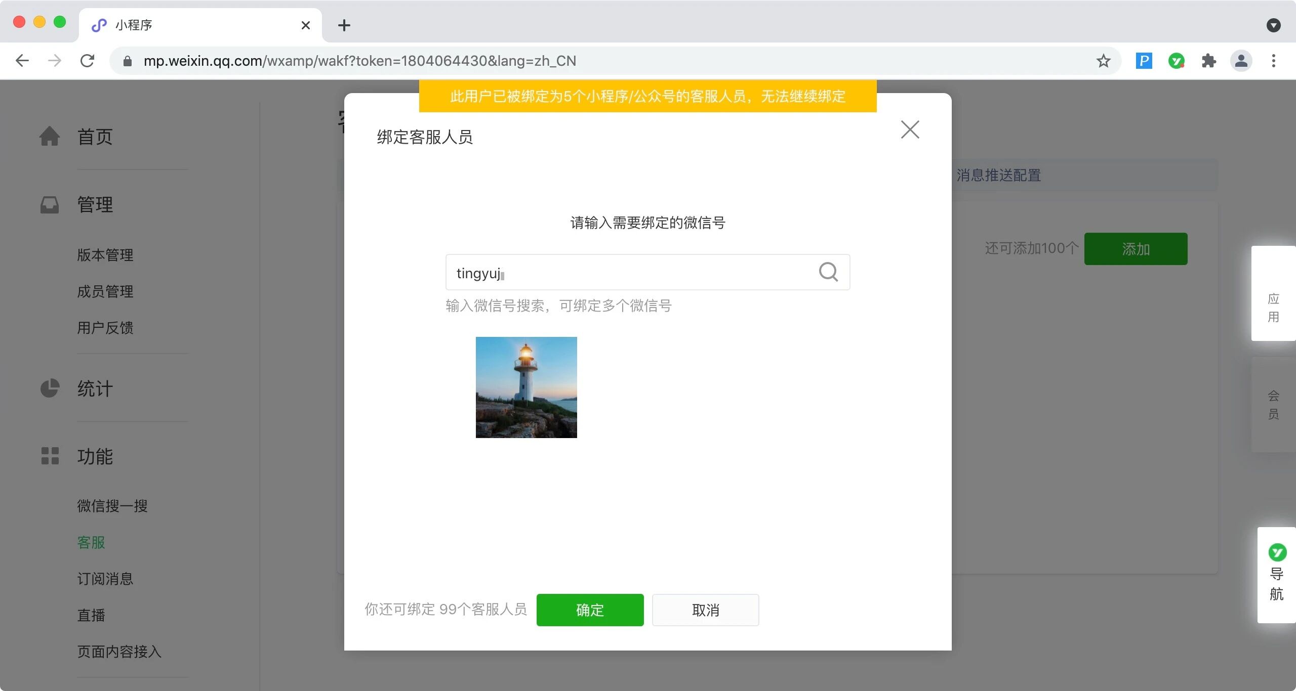 是这样的,我有一个微信号,扫客服小助手进去显示未成为任何账号的客服人员,无法登陆,但是在绑定的时候又提示已绑定五个