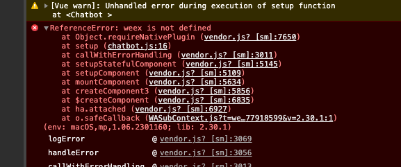 <chat bind:queryCallback="getQueryCallback" generic:queryMessage="queryMessage" generic:textMessage="customTextMessage" generic:weatherMessage="customWeatherMessage" generic:imageMessage="customImageMessage" generic:musicMessage="customMusicMessage" generic:newsMessage="customNewsMessage" generic:unsupportedMessage="customUnsupportedMessage" generic:guideCard="customGuideCard" generic:operateCard="customoperateCard" generic:miniprogramMessage="customMiniprogramMessage" generic:h5Message="customh5Message" generic:welcomeCard="customWelcomeCard" generic:feedsCard="customFeedsCard" > </chat>manifest.json 里配置 微信下的插件