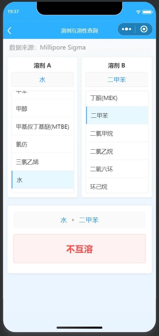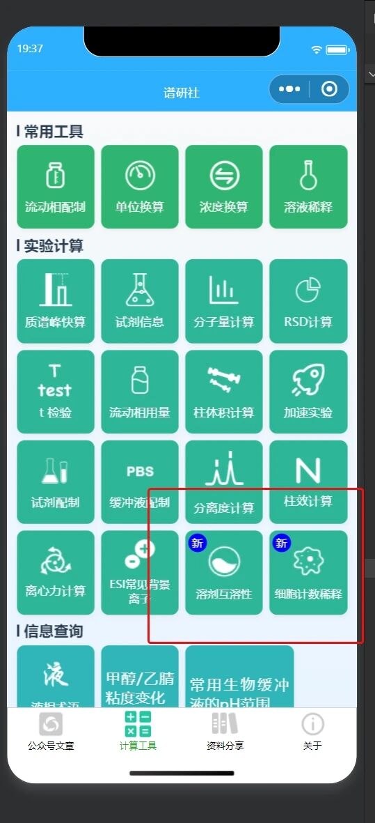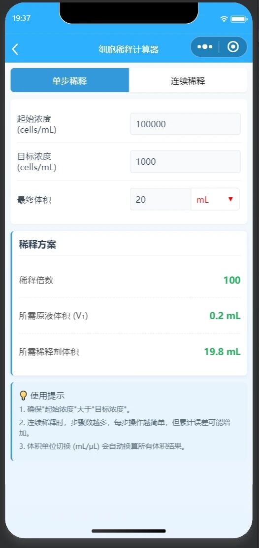 我今天(2026年1月16日)提交了一个版本更新,更新的内容是新增两个功能模块:即“溶剂互溶性查询”和“细胞计数稀释”两个。其中溶剂互溶性是一个查询功能,方便化学工作者快速查询溶剂间的互溶性。而细胞计数稀释是方便生物工作者进行快速稀释实验。二个功能截图和首页截图如下: