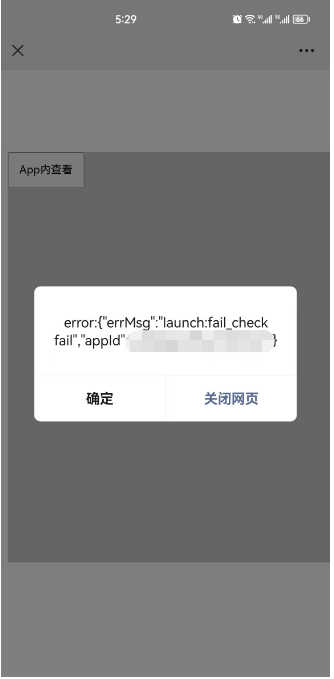 配置白名单之后,config:ok,wx.ready事件也有触发,text/wxtag-template里的按钮也正常显示出来了,但是最后点击按钮报错:launch:fail_check fail,有谁知道这问题怎么解决吗?