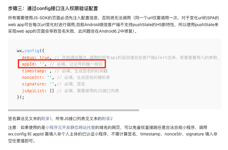 前端 wx.config 这一步的 appid 就填错了,需要填写公众号/服务号appid;后端获取 jsapi_ticket 的 access_token 也要换成使用这个公众号/服务号的。