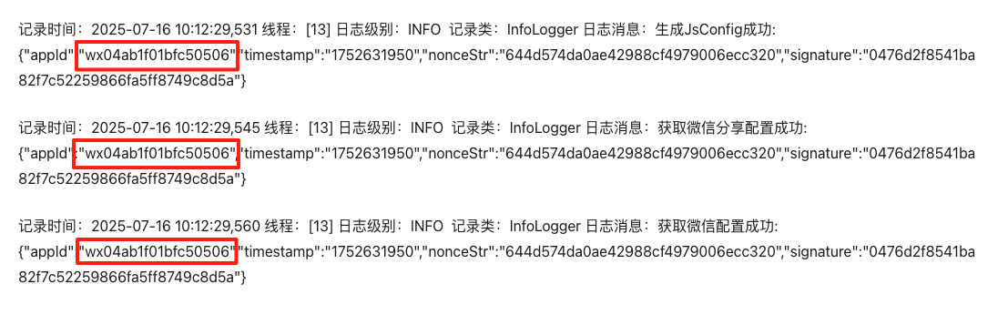 记录时间:2025-07-16 09:42:37,816 线程:[10] 日志级别:INFO 记录类:InfoLogger 日志消息:获取微信配置成功: {"appId":"wx04ab1f01bfc50506","timestamp":"1752630158","nonceStr":"1dff20f97b664663a99bd5d5bdc73e5e","signature":"b983c4a4385b616688e1f50996667cc73f5c3530"}