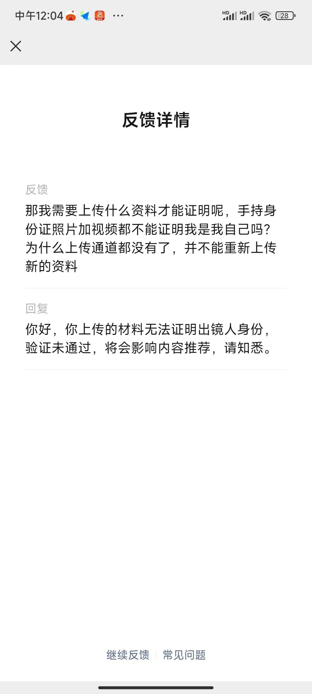 八月一号开始出现这种问题,导致账号被限流。找了出镜人录制了审核视频并附带手持身份证照片,身份证正反面照片,提交后一直不给通过,第三次的时候连重新提交材料的按钮都没有了,只能选择“我知道了”,后续各种渠道反馈无门,反馈后只有一句同样的回复~希望能有官方工作人员给于解答,这个认证需要哪些材料?重新提交应该在哪提交?