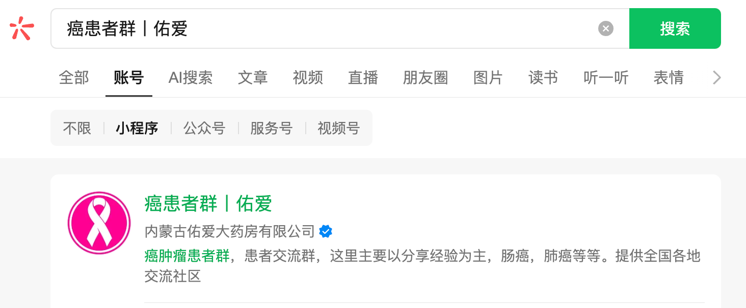 我的小程序在小程序搜索名称搜索不出来。名称是佑爱癌症化疗圈。我的appid是:wx3ee4d01e63e37e0d。请官方麻烦看下哦。搜索全称也没有