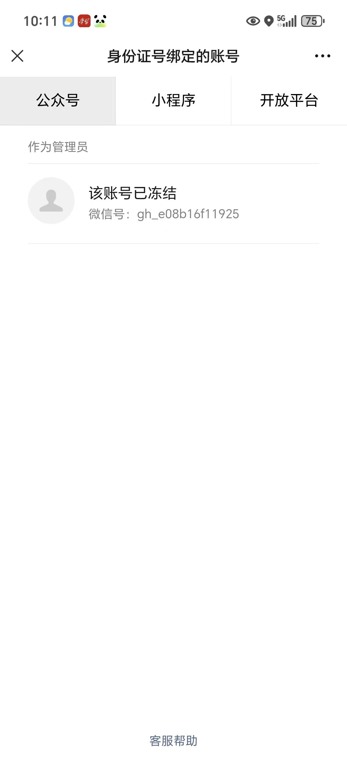 通过在【公众号安全助手】-【绑定查询】-【手机号绑定】,提示我新手机号是服务号的管理员;【身份证号绑定帐号】,则提示该帐号已冻结;【微信号绑定帐号】,则提示“你的微信号未绑定公众号”;