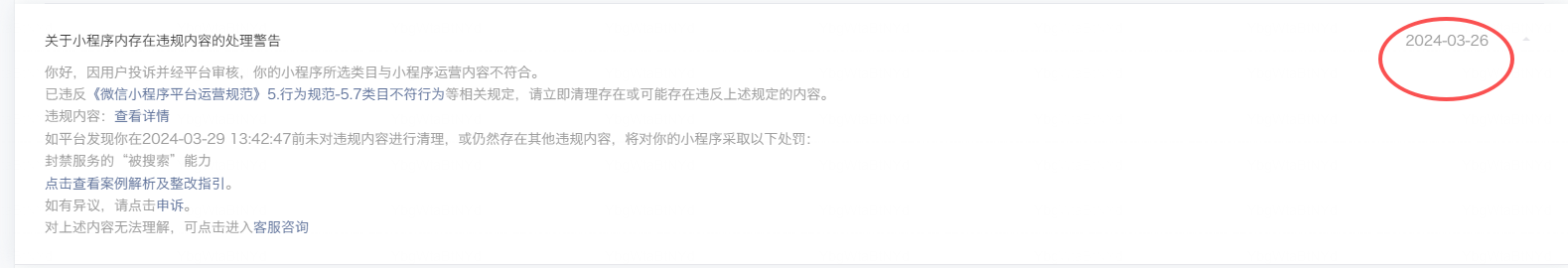 你好,经核实,小程序涉及类目不符违规,建议查看2024-03-29站内信整改发起申诉。