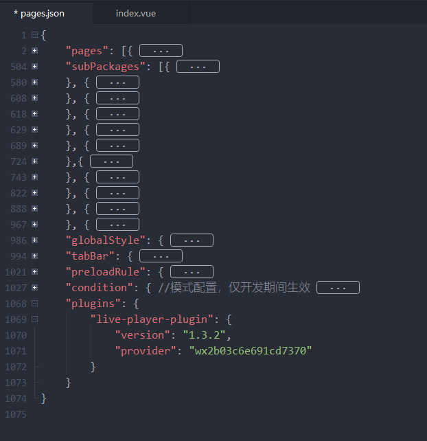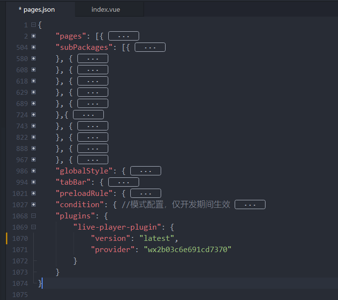 "mp-weixin" : { /* 小程序特有相关 */ "usingComponents" : true, "plugins": { "live-player-plugin": { "version": "1.3.5", "provider": "wx2b03c6e691cd7370" } }, }