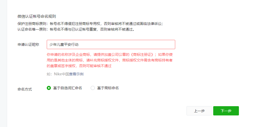 用户可以先选择基于商标的命名方式先提交认证,商标相关字段用其他证件(营业执照等)代替提交,审核公司后续核实后会帮用户更改为基于自选的命名方式认证