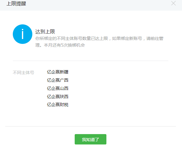 开放平台绑定公众账号时,已绑定了亿企赢陕西,主体是税友软件集团股份有限公司山西分公司,想新增绑定一个宁夏亿企赢公众号,主体和亿企赢山西一样,但提示不同主体已达上限