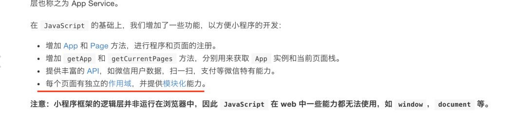 这样的话,建议在文档中说明下,否则很多人会真的以为小程序的每个页面是单独的模块,且拥有独立的作用域,这样的话如果在很多页面创建了比较多的全局变量,在页面销毁时有没有及时清理掉,肯定会导致内存泄漏的。