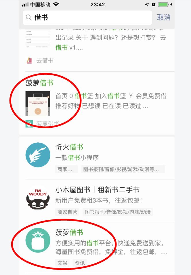 比如搜“借书”,有的时候能看见我的“菠萝借书”,有的时候看不见,道理一样的。