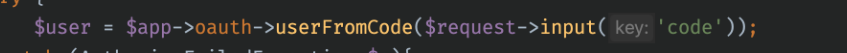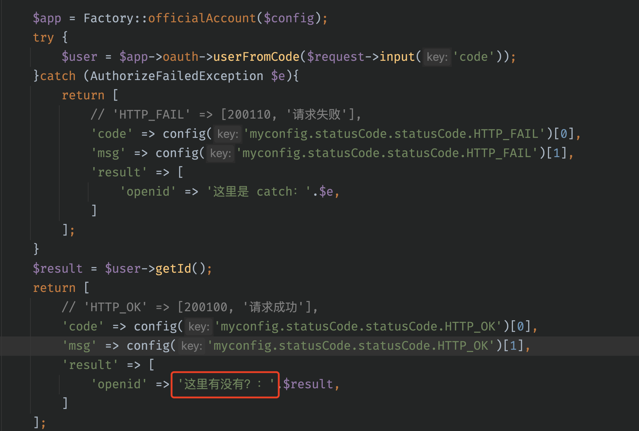 你这个 code 能正常获取到吗?先按照 easyWeChat 文档的第一种方式试试,用户访问页面时,在后端 php 处理静默授权(前端JS截图部分在后端处理),在回调地址完成信息入库,完成后跳转你需要返回的前端路由页面。