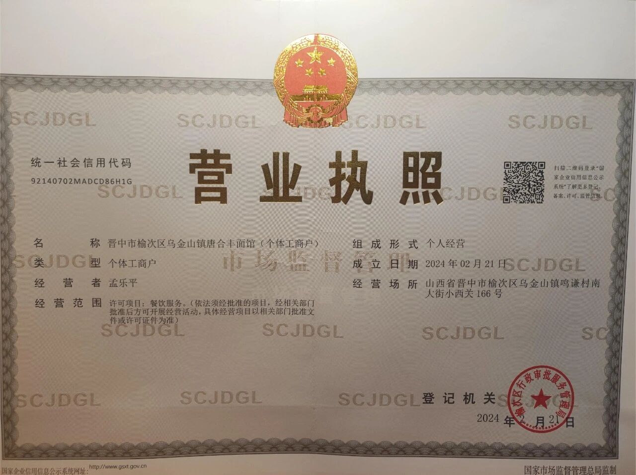 企业名称: 晋中市榆次区乌金山镇唐合丰面馆(个体工商户)