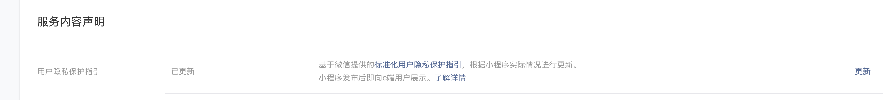1. app.json配置: "__usePrivacyCheck__": true 2. 小程序后台声明:用户隐私保护指引