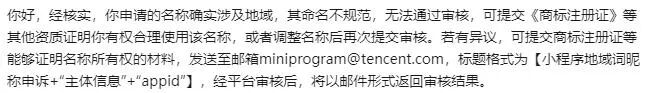 你好,平台希望每个小程序都能有独特性的,减少误导、混淆用户的理解。1.当前你所设置的小程序昵称涉及地域通用词,如需涉及地域,可采用申请主体所在地域+企业字号等来命名,或可提交商标注册证或其他能够证明”名称(简称)“所有权的材料,发送至邮箱:miniprogram@tencent.com,标题格式为【小程序昵称(简称)申诉+“主体信息”+appid,经平台审核后,将以邮件形式返回审核结果;