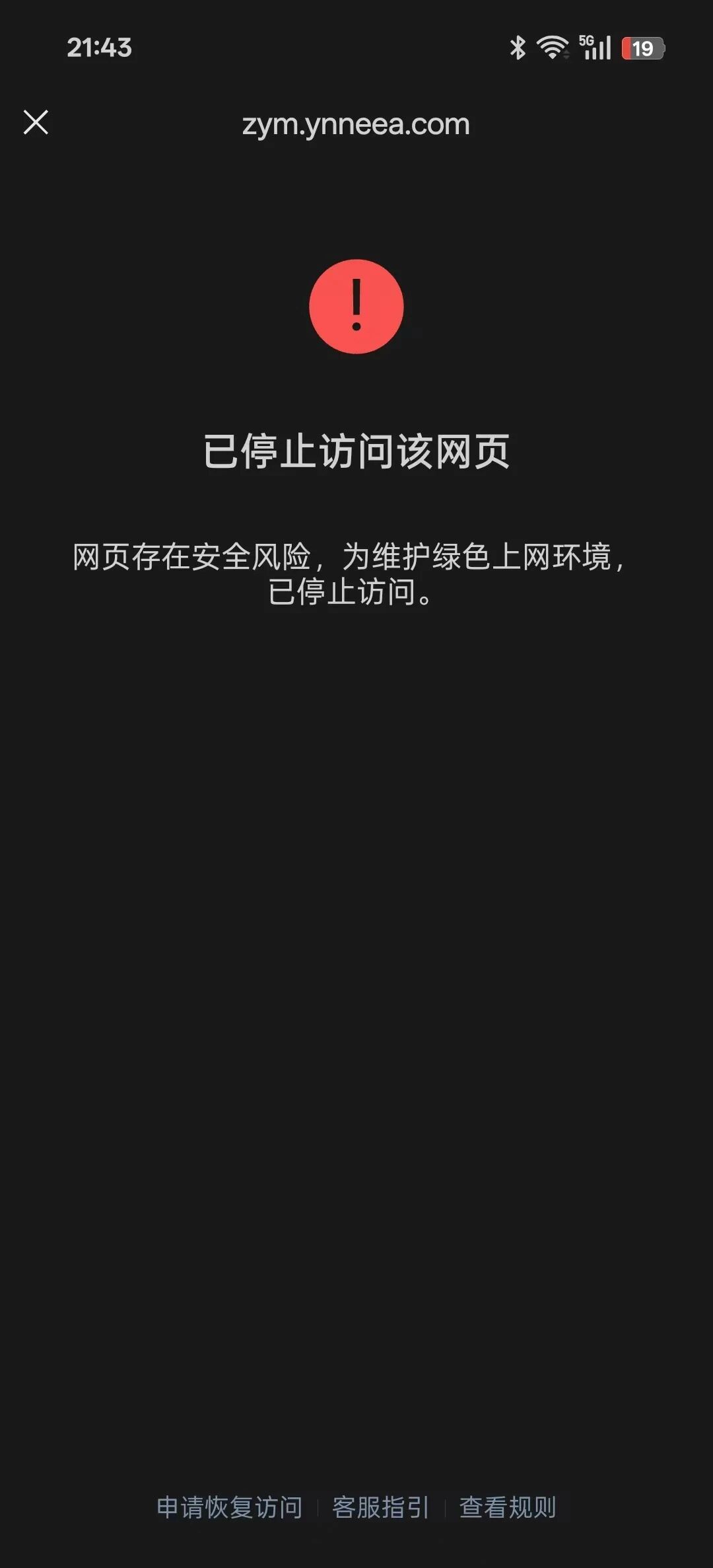 您好,域名ynneea.com在西部数码注册并通过优刻得备案通过,我是网站开发者,访问时间如图2025/10/1,点开网址提示“网页存在安全风险,为维护绿色上网环境,已停止访问。”经检查网页里没有不安全的内容,请核实后帮忙解除拦截,谢谢!尽快处理,急急急,现在需要打开使用,谢谢!