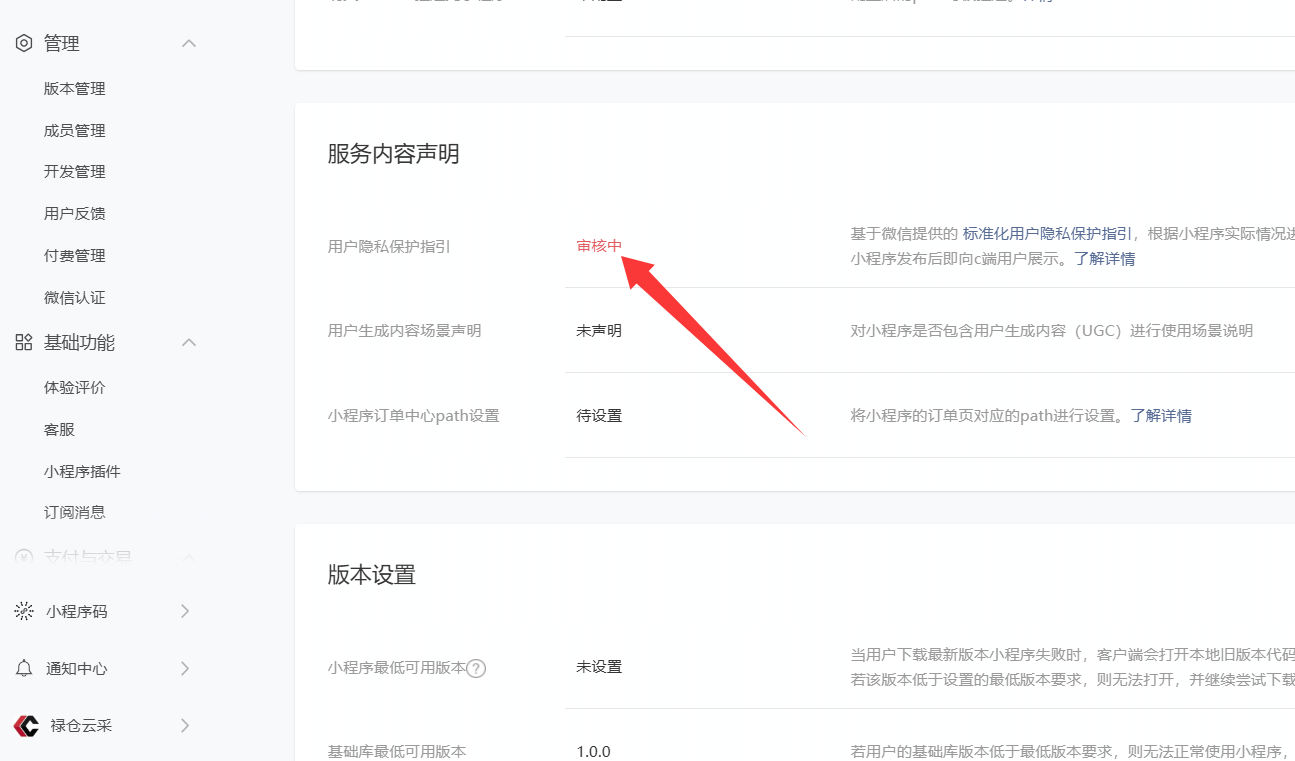 并且还未发布过版本,所以没有这个路劲:管理—版本管理—提交代码审核—信息填写页面—用户隐私保护指引设置