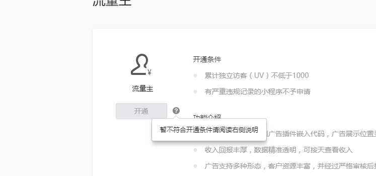 小程序流量主准入判断接口数据可能存在一定延时,部分达标小程序可能暂无法自助开通流量主。开发同学正在处理并升级系统,建议可在今天(7月10日)下午再次尝试。