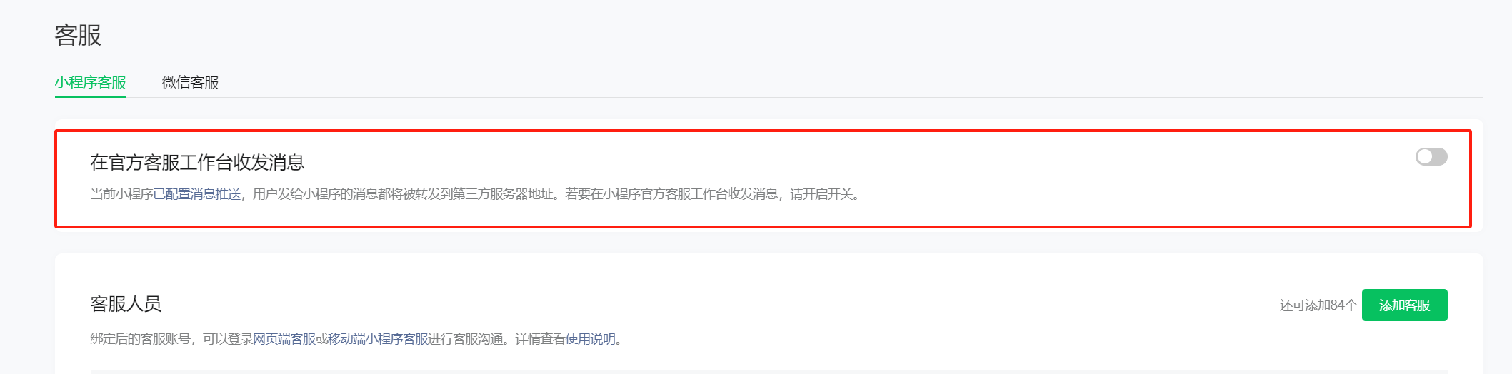 但是再小程序后台 把"在官方客服工作台收发消息"这个功能开启再关闭后,有些用户自动回复就收不到消息了,应该还是保持着开启状态