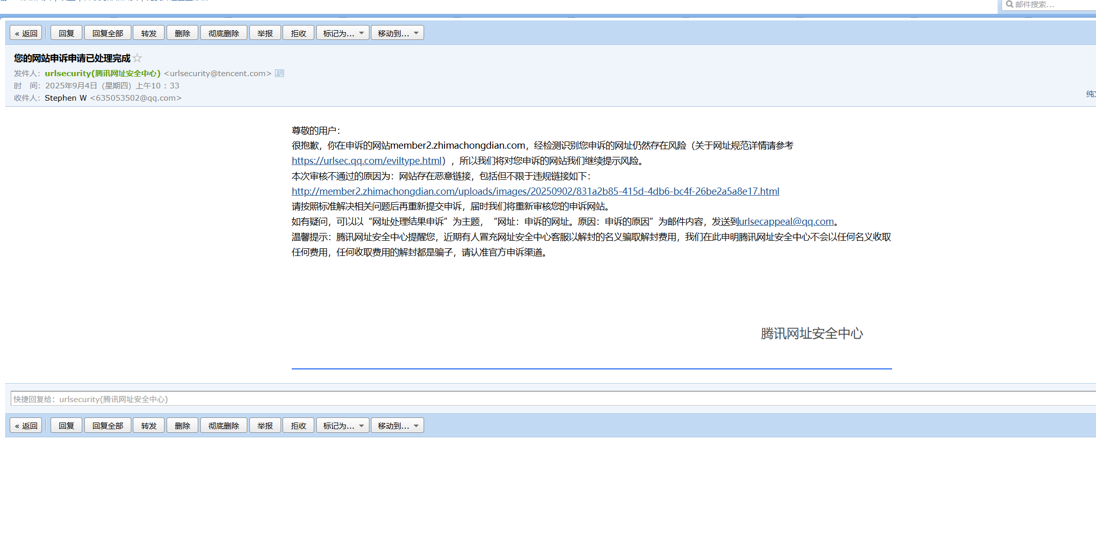 你好,经核实,域名member2.zhimachongdian.com 手机管家拦截,此处只处理被微信暂停提供微信内直接访问的服务的外部链接的申诉问题,建议登录手机管家官网【http://gj.qq.com/online_server/complain_url.html】自行申诉,知悉。