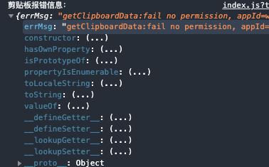 都检查过没问题了,还是报 {"errMsg": "getClipboardData:fail jsapi has no permission, event=getClipboardData, runningState=foreground, permissionMsg=permission got, detail=jsapi has no permission, appId=;, "errno": 102}