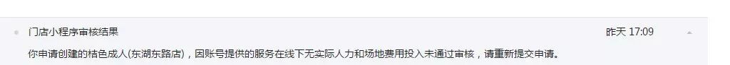 “因账号提供的服务在线下无实际人力和场地费用投入未通过审核,请重新提交申请“