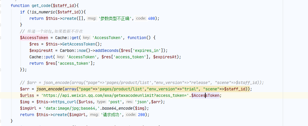 代码敬上,appid和secret我是直接写在配置文件里得,能正常访问、生成token,生成连接也看过是对应小程序得,但是到生成二维码并扫码跳转得时候就跳的不对