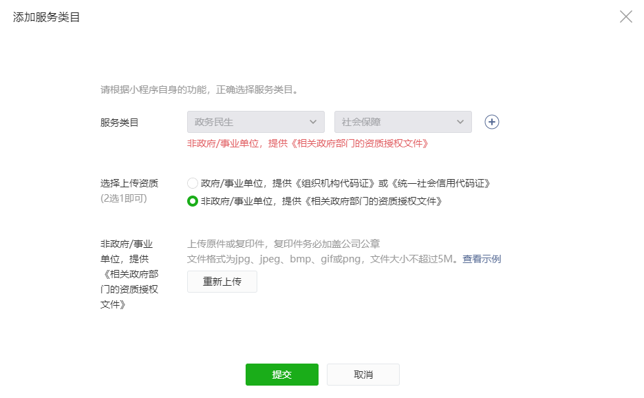 你好,经核实,用户小程序涉及提供社保查询,请补充选择”政务民生-社会保障“类目,用户需根据对应的服务内容,提交对应主管部门(如:社保局)的授权。