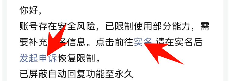 通知这里先实名,然后发起申诉恢复限制。
