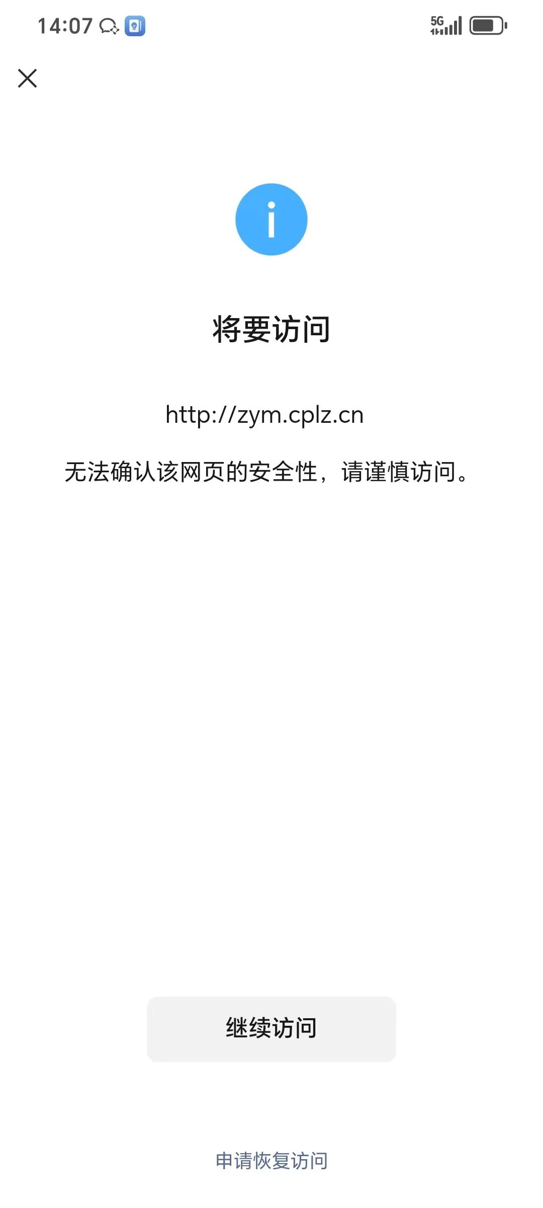 您好,域名cplz.cn在阿里云注册并备案通过,http://zym.cplz.cn/浏览器访问正常,我是网站开发者,访问时间如图2026/3/13,点开网址提示“无法确认该网页的安全性,请谨慎访问。”经检查网页里没有不安全的内容,请核实后帮忙解除拦截,谢谢!尽快处理,急急急,现在需要打开使用,谢谢!